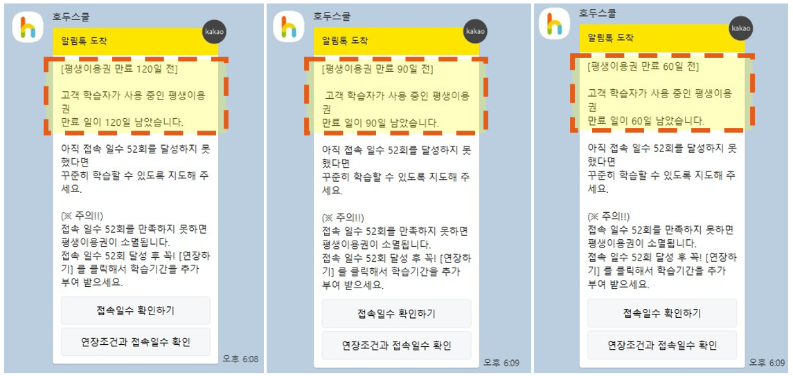 평생이용권의 학습기간이 만료가 되기 전 총 3회에 걸쳐 안내메시지를 드리고 있어요.